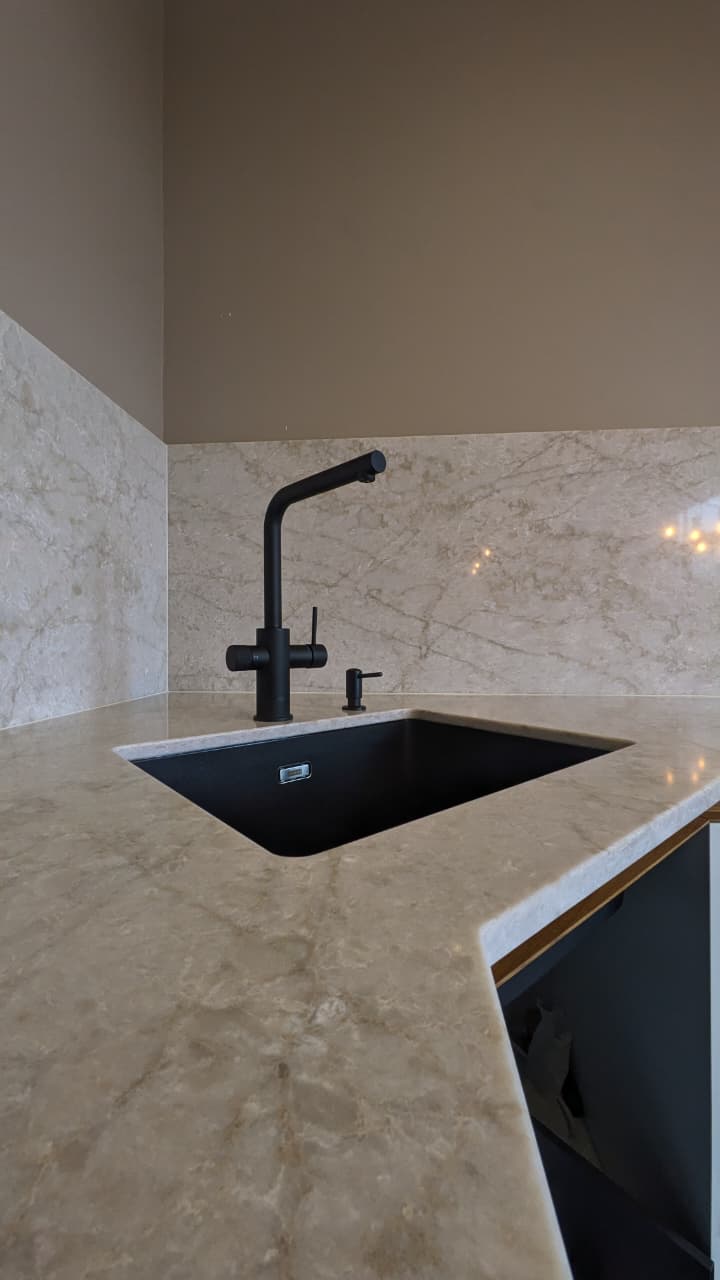 Kvarcas yra atsparus įbrėžimams ir dėmėms, todėl puikiai tinka virtuvės stalviršiams, vonios kambario paviršiams ir kitoms sritims, kuriose reikia tvirtos ir patvarios medžiagos. Reguliarus valymas muilu ir vandeniu arba specialiu kvarco valikliu padės išlaikyti gražią stalviršių išvaizdą ilgus metus.